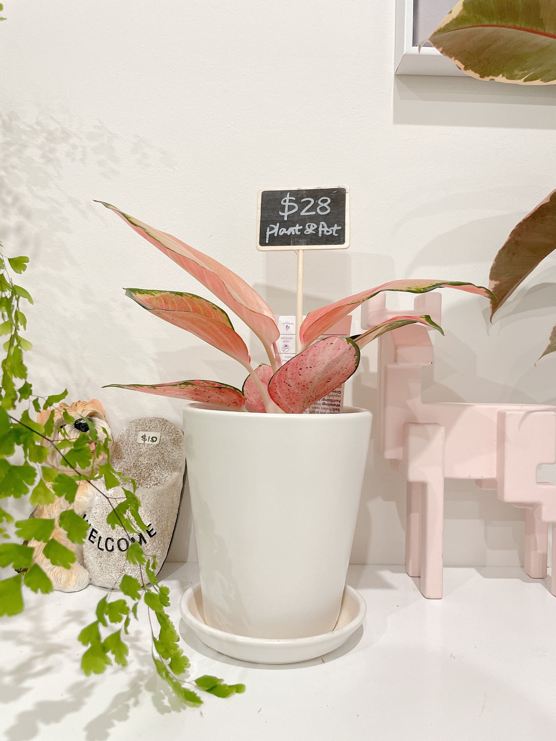 Aglaonema Red valentine pink leaf plant indoor foliage white ceramic pot saucer delivery available